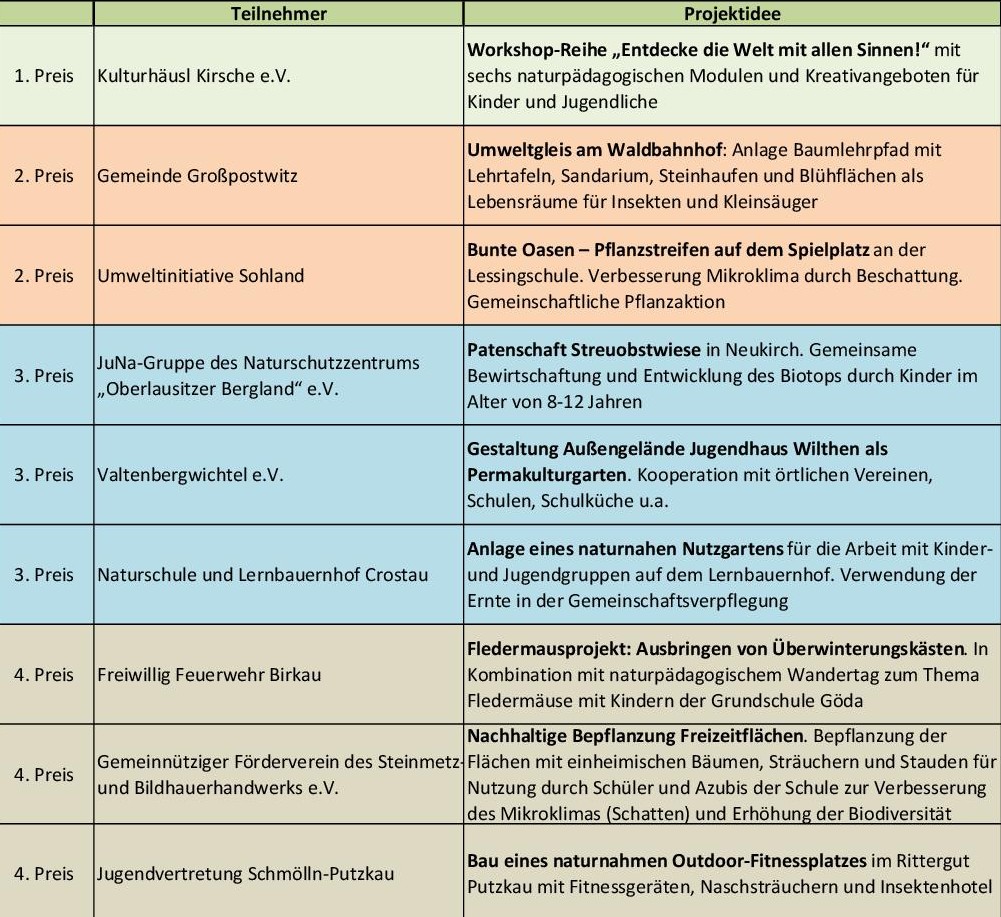Bis Anfang September konnten Vereine, Initiativen, Schulklassen und andere Gruppen aus dem Bautzener Oberland ihre Projektskizzen einreichen. Eine Jury aus Mitgliedern des Vereins zur Entwicklung der Region Bautzener Oberland e.V. hatte die Preisträger in ihrer Sitzung Anfang Oktober ausgewählt. Die Preisgelder zwischen 500 Euro und 3.000 Euro sollen dabei helfen, die Projektideen umzusetzen. Die LEADER-Region Bautzener Oberland gratuliert den Preisträgern und wünscht viel Erfolg!