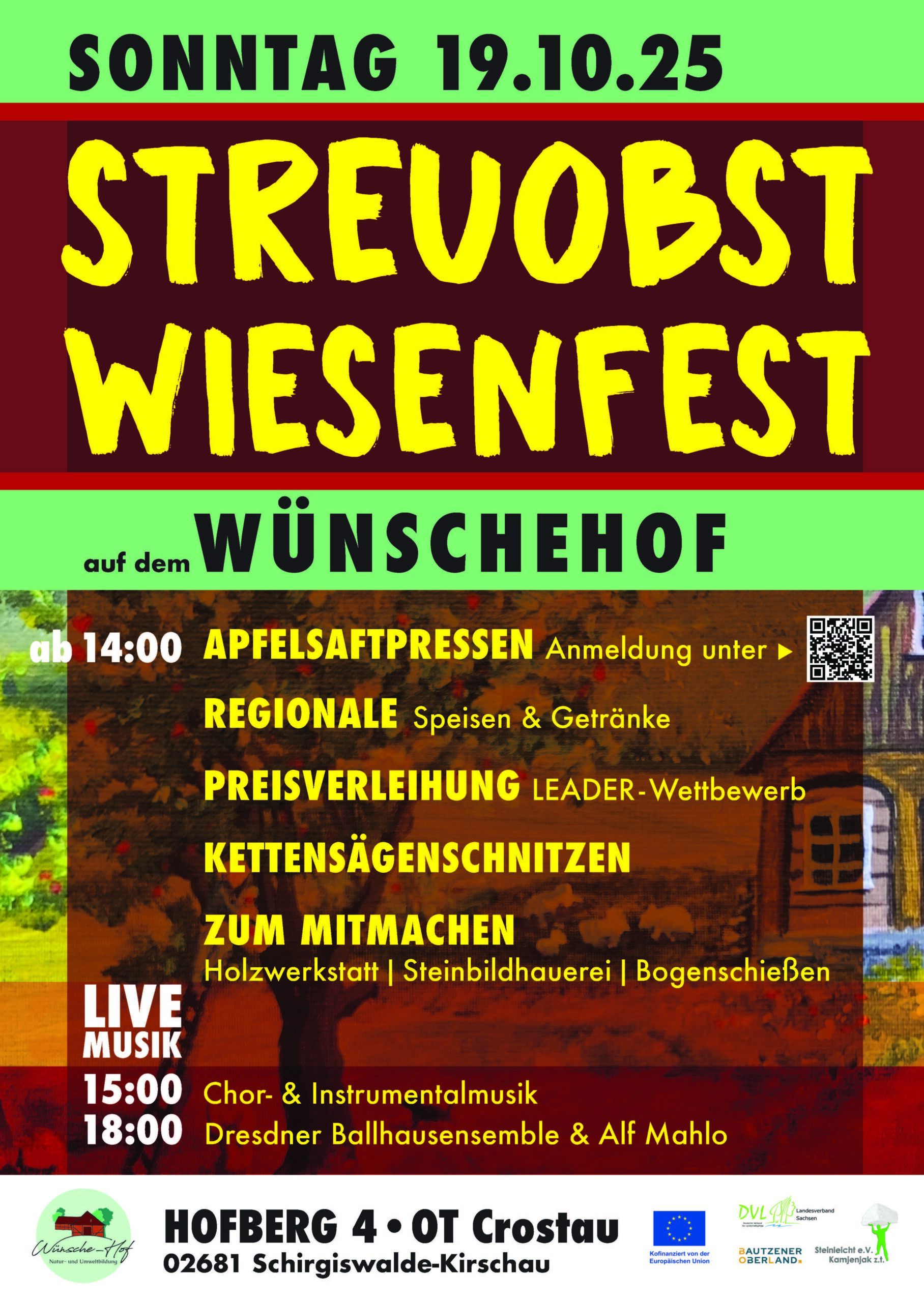 Die LEADER-Region Bautzener Oberland lädt am Sonntag, den 19. Oktober 2025 zum Streuobstwiesenfest auf den Wünschehof nach Crostau ein. Ab 14 Uhr erwartet alle Besucher ein buntes Programm mit Kettensägenschnitzen, Steinbildhauerei, Bogenschießen und geöffneter Holzwerkstatt. Auch das Pressen des eigenen Apfelsaftes ist nach Anmeldung möglich. Eingerahmt von Chor- und Instrumentalmusik sowie einem Auftritt des Dresdner Ballhausensembles mit Alf Mahlo findet die Preisverleihung des LEADER-Wettbewerbs „Natur und Umwelt“ statt. Wir freuen uns auf Ihren Besuch!